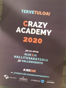 Jyväskylän Nuorkauppakamari järjesti marraskuun lopussa Crazy Academyn eli C-alueen Hallitusakatemian 2020, jonka tapahtumat kokosivat Jyväskylään yli sata nuorkauppakamarilaista. Mukana oli edustus Länsi- ja Keski-Suomen kattavan alueemme kaikista 19 nuorkauppakamarista, joten viikonloppu tarjosi mahtavan tilaisuuden verkostoitua yli kamarirajojen. Kyse oli suurimmasta Jyväskylässä järjestetystä nuorkauppakamareiden kokous- tai koulutustapahtumasta sitten vuoden 2011, jolloin kansallinen vaalikokous houkutteli Jyväskylään yli 700 osallistujaa.