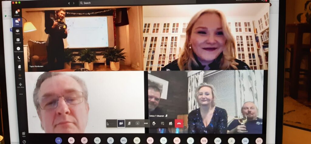 Juhla sujui melkoisen mukavasti. Yllätyksellisesti suunnitteluosastokin pursusi ideoita ja villejä heittoja, kun toteutusmalli vaihtui etäilyksi. Kuten nyt vaikkapa pukukoodiksi valittu ”juhlava yuläosa”. Valitsimme ajatuksista ”medium-plus”-tason: ei joulupuuroja väärään kurkkuun, mutta varmasti kiinnostavia hetkiä kaikille.