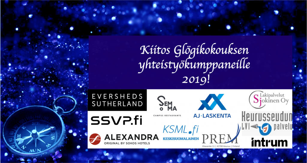 Vuoden 2019 Glögikokouksen kumppaneita olivat: SSVP Finland Oy, Keskisuomalainen, Eversheds Sutherland, Semma, AJ-Laskenta, S. Lakipalvelut Jokinen Oy, Keurusselän LVI Palvelut, Prem, Intrum ja Original by Sokos Hotels Alexandra. Suuret kiitokset kaikille yhteistyökumppaneille!