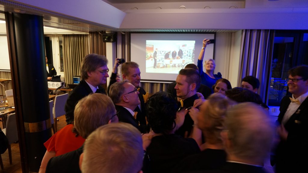 Yllätykseni olikin suuri, kun puheenjohtaja Susanna Hämäläinen kutsuikin minut takaisin lavalle – saatuani tarvitsemani kävelykepin – ja sain Jyväskylän kamarin kunniajäsenyyden! Seuraavana vuonna olisinkin sitten Glögikokouksessa ”Timanttipöydässä” muiden senaattorien ja kunniajäsenten kanssa. Olen erittäin ylpeä ja kiitollinen tästä kunnianosoituksesta, joka minulle kokouksessa suotiin. Korkean iän ja heikentyneen terveyden kanssa kamppaillen.