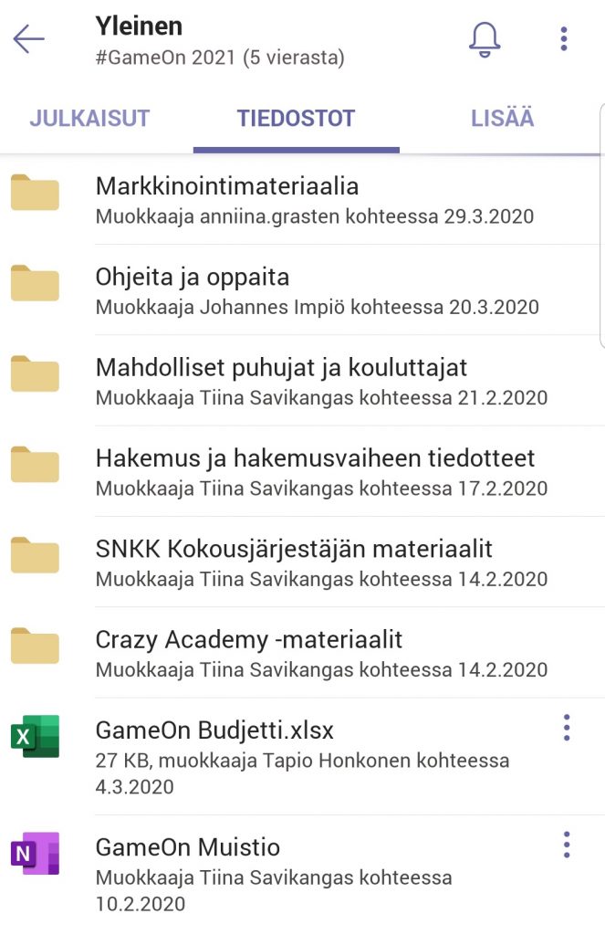 Teamsin käyttöä alettiin pilotoida jo viime syksynä Crazy Academy -projektissa, jonka dokumentaatio ja projektinhallinta hoidettiin pääsääntöisesti suoraan Teamsissa. Alkuvuodesta Teamsia on käytetty aktiivisesti myös #GameOn! -aluekokoushaun yhteydessä. Kokouksen omassa ryhmässä esimerkiksi työstettiin budjettia ja hakemusta sekä pidettiin reaaliaikaisesti kirjaa kamarien puheenjohtajille suunnatun soittokierroksen etenemisestä.