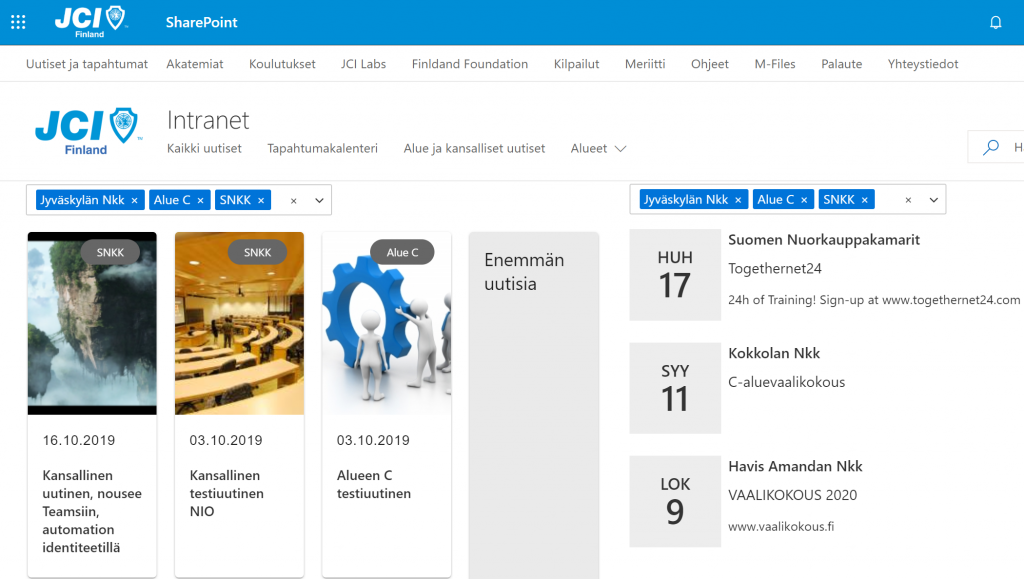 Suomen Nuorkauppakamareissa on meneillään viestintäuudistus, jossa monille eri sivuilla ja alustoille pirstaloitunutta sisäistä viestintää keskitetään yhdelle alustalle tiedon löytämisen ja keskustelujen seuraamisen helpottamiseksi. SNKK on hankkinut kansallisesti käyttöön Office 365 -palvelun, johon jokaiselle jäsenelle on luotu etuimi.sukunimi@jci.fi -tunnus. Tällä tunnuksella pääsee käsiksi myös vielä testivaiheessa olevaan SNKK:n viestinnälliseen intranetiin (sivusto vaatii kirjautumisen), jossa on mahdollista seurata keskitetysti haluamiensa kamarien ja alueiden uutisia ja tapahtumia.