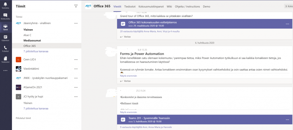 • Kun olet päässyt kirjautumaan Teamsiin JCI-tunnuksilla, Jäsenryhmän Office 365 -kanavan keskustelualueelta löydät webinaaritallenteita, joilla opastetaan Teamsin käytön saloihin erityisesti kamarinäkökulmasta.