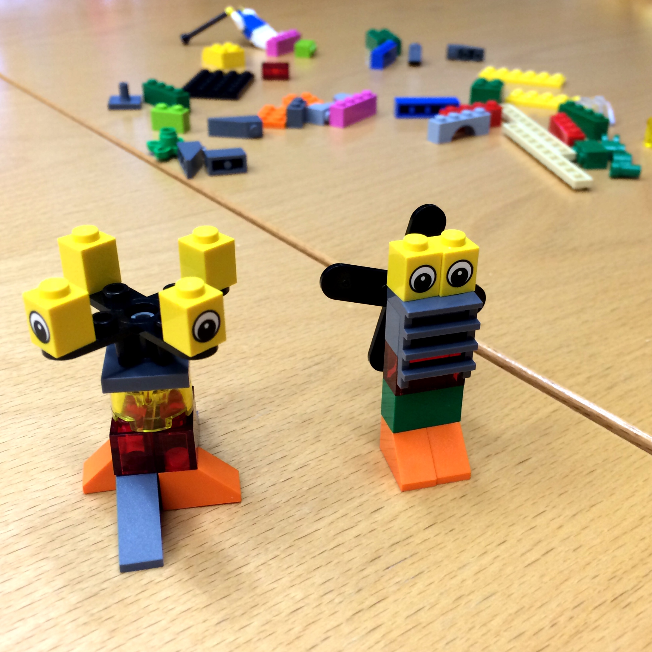Aloitimme lämmittelytehtävällä: Poimikaa kaikki keltaiset sekä oranssit palikat ja rakentakaa niistä ankka, aikaa on 90 sekuntia. Ajan päättyessä esittelimme vuorotellen tuotoksemme ja Härtelin kehotuksesta perustelimme, miksi ankkamme on ankka.