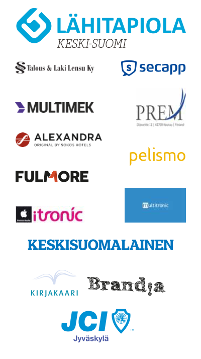 Suomi 100 -glögikokouksen hteistyökumppaneina toimivat LähiTapiola Keski-Suomi, Fulmore, Keskisuomalainen, Kirjakaari, Magister Solutions/Secapp, Multimek, Multitronic & iTronic, Pelismo, Prem, Sokos Hotel Alexandra sekä Talous ja Laki Lensu ky. Suuret kiitokset kaikille yhteistyökumppaneille tapahtuman mahdollistamisesta!