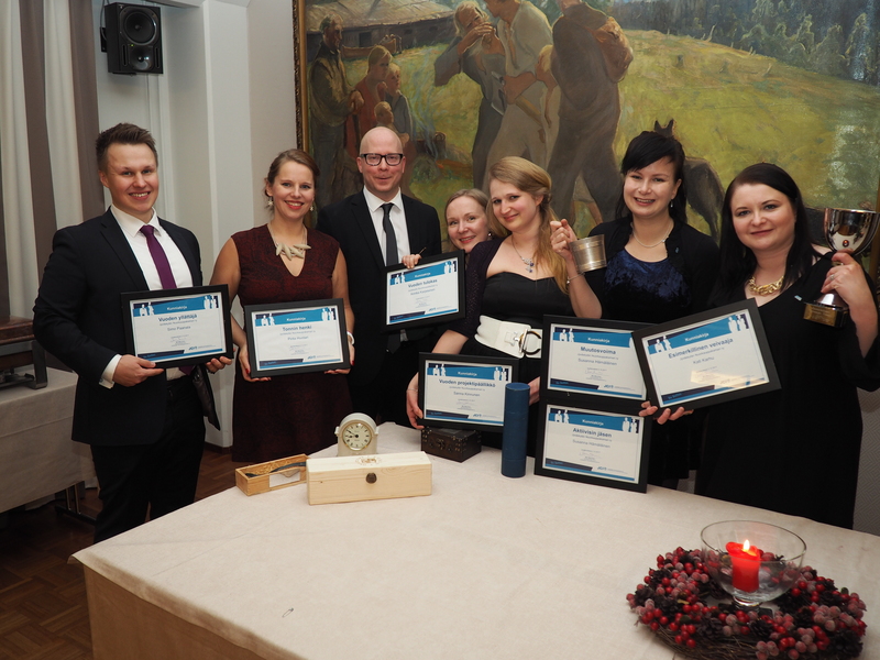 Kuvassa vasemmalta Jyväskylän nuorkauppakamarin palkitut 2017: Vuoden yllättäjä Simo Paanala, Tonnin henki Pirita Huotari, Kamarin vanhin Tero Rautiainen, Vuoden tulokas Annika Karjalainen, Vuoden projektipäällikkö Sanna Kinnunen, Vuoden aktiivisin jäsen ja Muutosvoima Susanna Hämäläinen sekä Esimerkillinen veivaaja Kati Karhu.