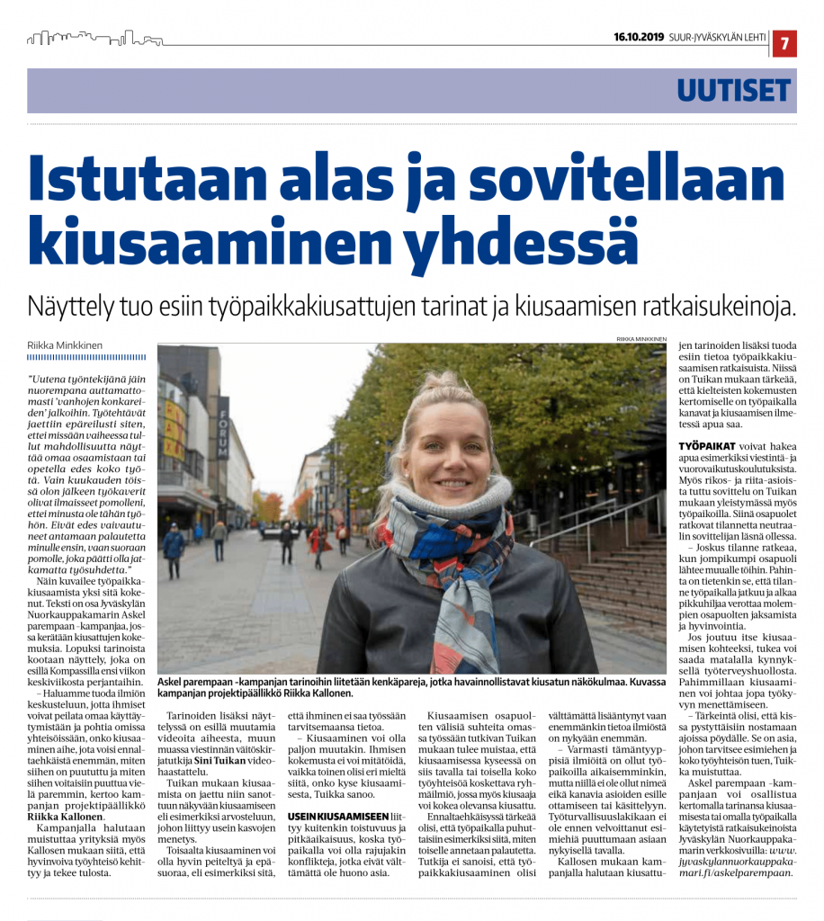 Suur-Jyväskylä lehti 16.10.19: ”Istutaan alas ja sovitellaan kiusaaminen yhdessä”. by admin · 17 lokakuun, 2019
