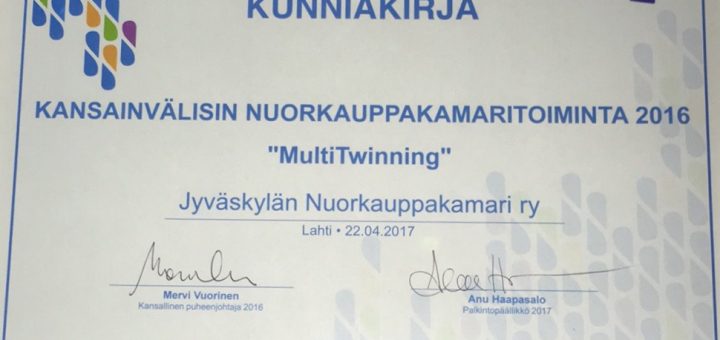 Jyväskylän Nuorkauppakamari vastaanotti lauantai-iltana 22.4. “Kansainvälisin kamaritoiminta 2016” palkinnon osana Suomen Nuorkauppakamarit Ry:n kansallista vuosikokousta. Palkinto myönnettiin Jyväskylän kamarille monipuolisen kansainvälisen toiminnan ansiosta. Kansainvälisyys oli vuonna 2016 koko Suomen Nuorkauppakamarin strateginen teema joka näkyi...