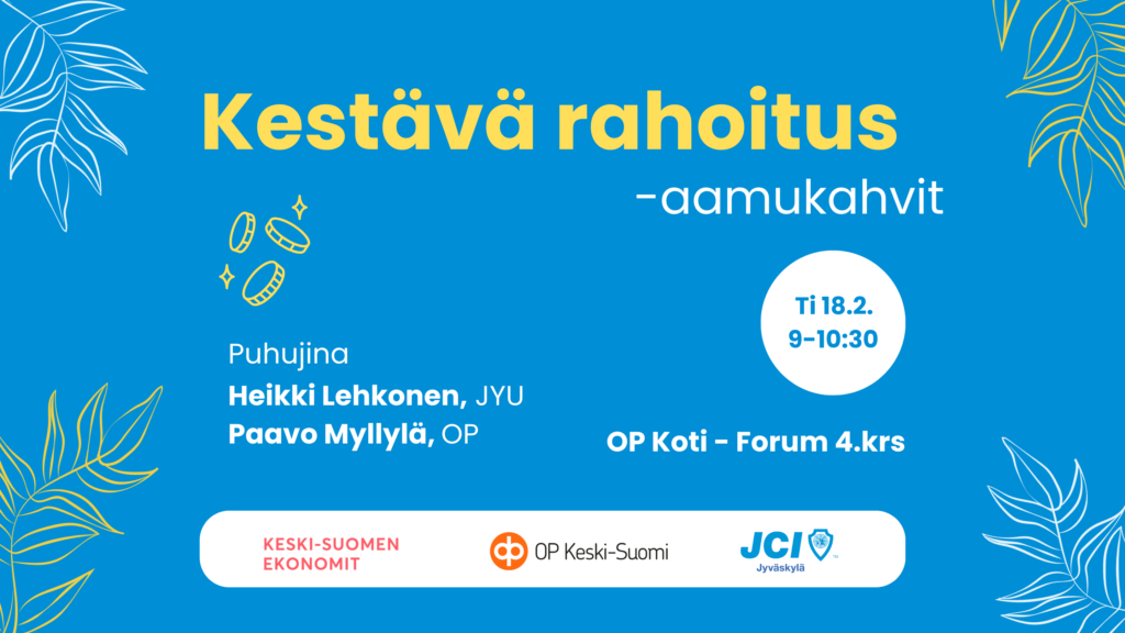 Jyväskylän Nuorkauppakamari, Keski-Suomen Ekonomit  ja OP Keski-Suomi järjestävät yhteistyössä ajankohtaista asiaa kestävästä rahoituksesta tapahtuman Jyväskylässä 18.2 klo 9 alkaen.