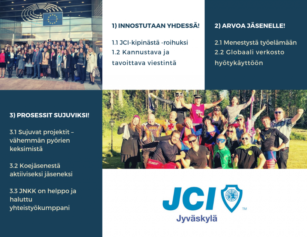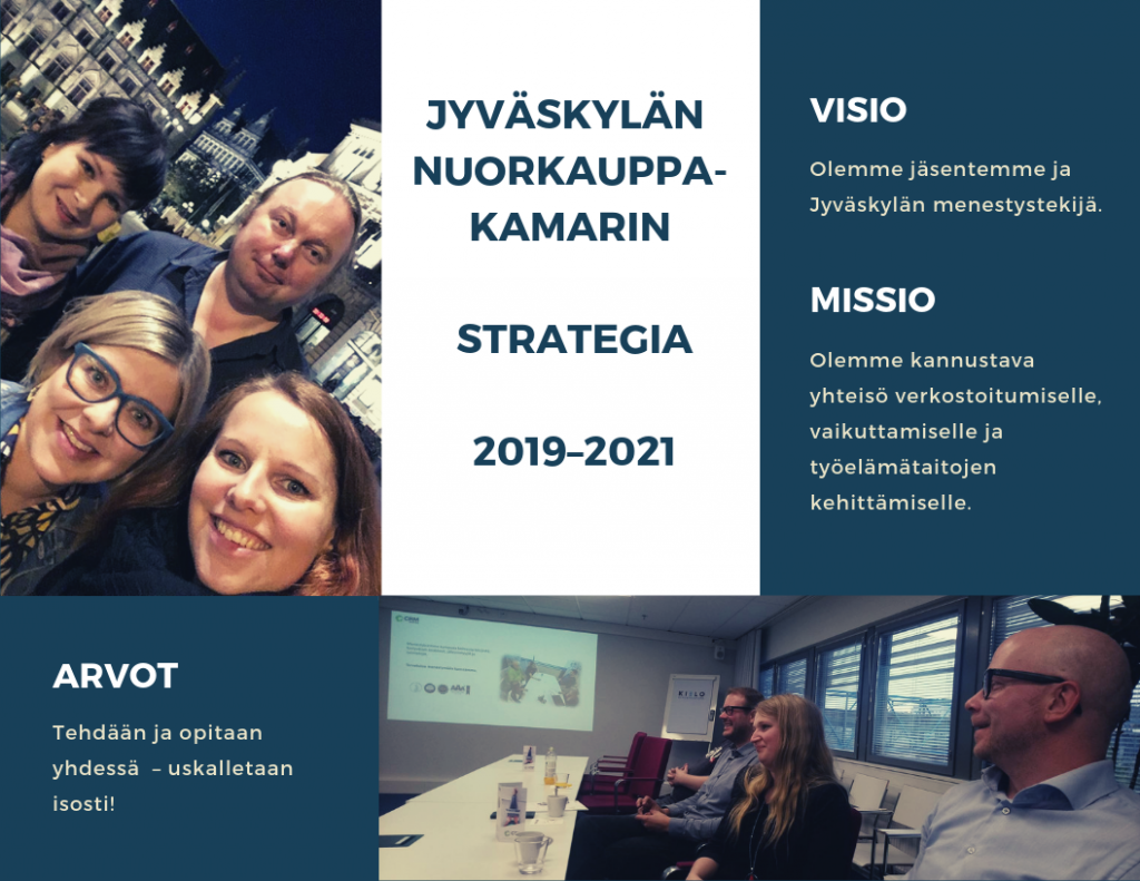 Jyväskylän nuorkauppakamarin visiona on olla jäsentemme ja Jyväskylän menestystekijä. Kamarimme vahvana arvona on ” Tehdään ja opitaan yhdessä – uskalletaan isosti!”